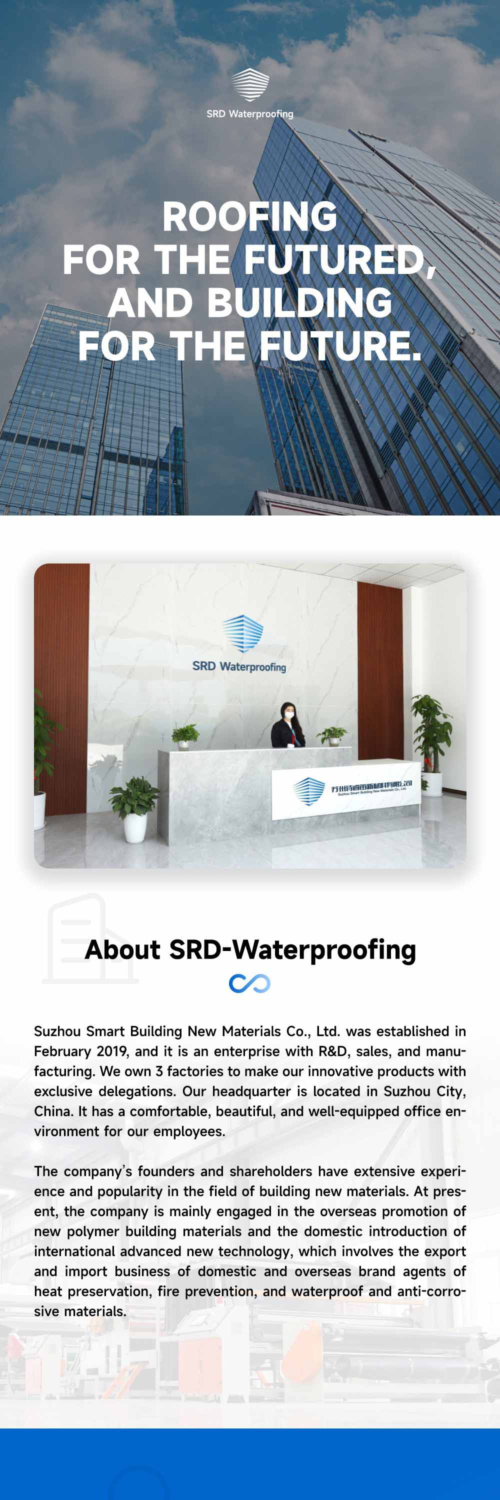 SRD is the professional leading manufacturer/trader with waterproofing materials, and we supply high quality below grade Pre-applied HDPE system, High quality PU liquid applied foundation wall, deck washroom and kitchen, and other tapes and sealant product
